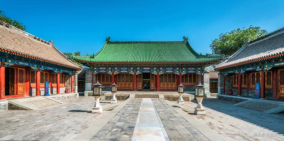 屋顶敷设绿色琉璃瓦,屋脊立吻兽;如此形制,于清代为城门、亲王府邸专用。
